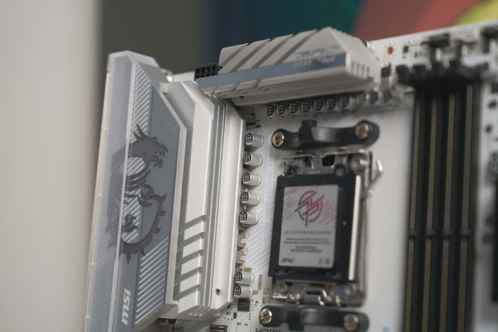 主板颜值出众,合座以浅近大气的白色为基底,正面铺满了工艺精真金不怕火的银白色金属组件,线条利落且质感细巧,既突显了节约好意思学,又通过金属材质的点缀进步了居品的高档感,一眼就能收拢眼球。