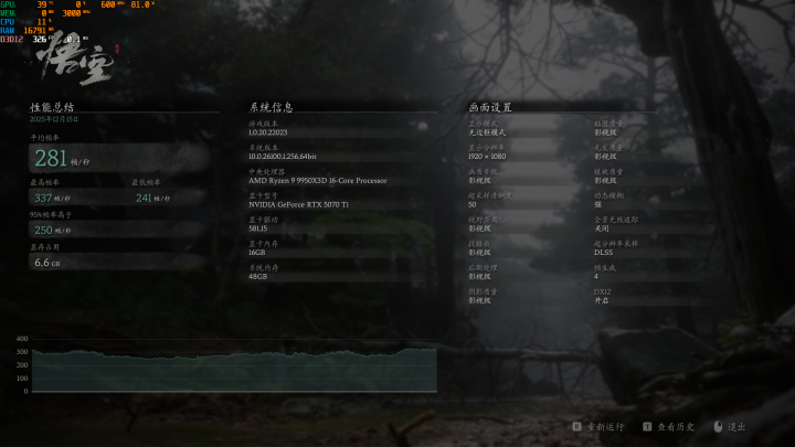 在另一款同为画质标杆的 3A 大作《黑传说:悟空》中,将画质拉满至影视级档位、超采样了了度设为 50%,并开启 DLSS 4 后,实测游戏平均帧率高达 279.0 FPS,1% Low 帧率亦踏实在 57.9 FPS。即便在电影级画质的极致设定下,仍能兑现超高帧率畅达开动,既保留了游戏中细巧的场景渲染与光影阐扬,又确保了操作反馈的丝滑连贯性,为玩家带来兼具视觉触动与千里浸体验的顶级游戏阐扬。