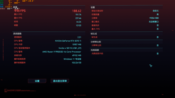 在画质标杆级 3A 巨作《赛博一又克 2077》的实测场景中,当设定为 1080P 分辨率 + 超等画质档位,且未启用任何超分技能时,游戏平均帧率高达 188.3 FPS,1% Low 帧率更踏实在 123.2 FPS。即便在拉满画质的极致设定下,仍能呈现丝滑无卡顿的顶级游戏画面,无论是光影渲染的细巧度如故动态场景的畅达度,都能为玩家带来千里浸式体验,充分展现硬件平台的强悍图形处理实力。
