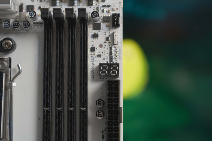 主板右上角布局紧凑且功能都全,配备 4 个 4Pin 电扇供电插座,可骄矜多电扇散热系统膨大需求;同期设有 1 个 5V 三针灯效接口,方便用户连络 RGB 确立打造个性化光效。此外,该区域还搭载由 4 颗 LED 构成的 Debug 指导灯,搭配两位数码屏,能直不雅表露平台开动现象,助力快速排查开机故障。