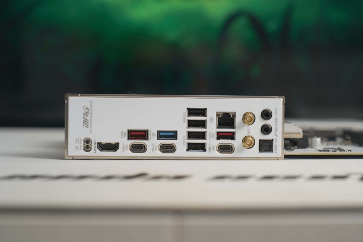 主板 IO 挡板接口建立全面且布局规整,从左至右交替为:BIOS 刷写按钮、BIOS 捣毁按钮、HDMI 视频接口、3 个 USB-C 10G 接口、2 个 USB 10G Type-A 接口、1 个 USB 5G Type-A 接口、4 个 USB 2.0 接口、WIFI 7 天线接口,以及包含 1 个光纤 S/PDIF 接口在内的 3 组音频接口,全面障翳视频输出、高速传输、网罗连络及音频输出等日常使用需求。