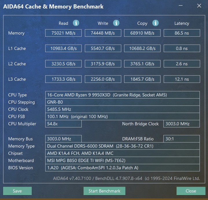 内存依然是那套6000C28的 24G*2的便条,跑分平方。