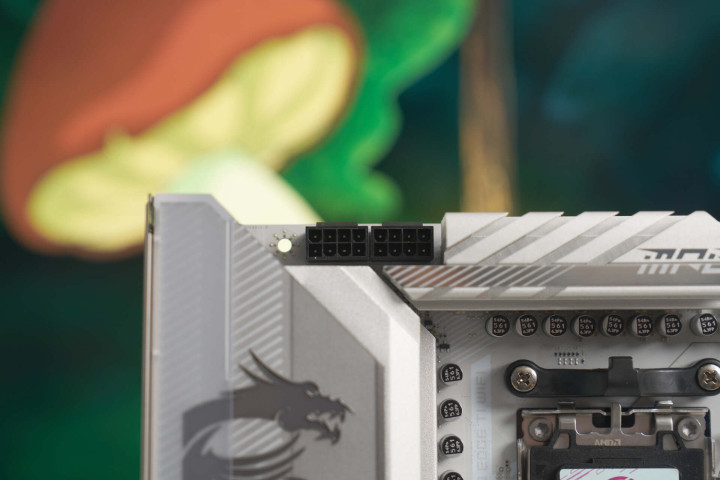 主板左上角布局有 CPU 补助供电插座,采用双 8Pin 野心。