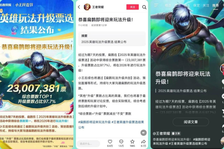 治服环球齐看到了,昨天小王公布的【2025年豪杰玩法升级票选】投票收尾。扁鹊以概括票数23,007,381票、升级票数占比97.7%的十足上风得回第一,也就意味着将在2026年迎来玩法升级。