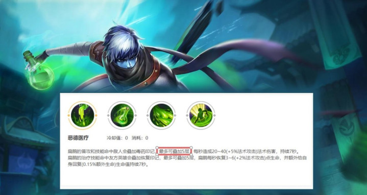 扁鹊的被迫妙技是重叠毒药图章,给敌东谈主叠不错握续7秒掉血,给我方和队友是握续7秒复原生命值,齐是最多重叠5层才能达到最好的恶果。